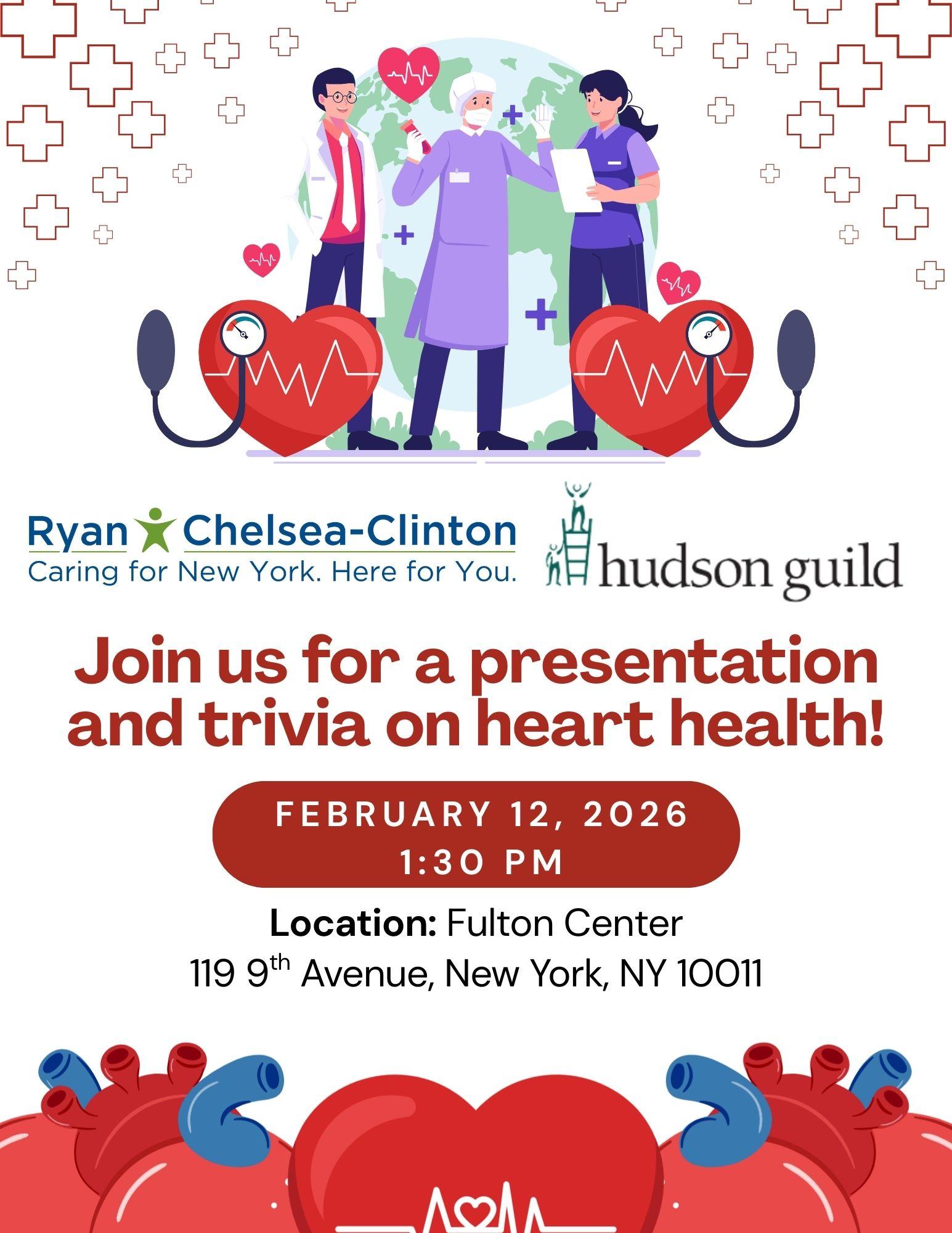 Ryan Chelsea-Clinton will be at Hudson Guild on Thursday, February 12th to present on ways seniors can keep their heart healthy for American Heart Month‼️
